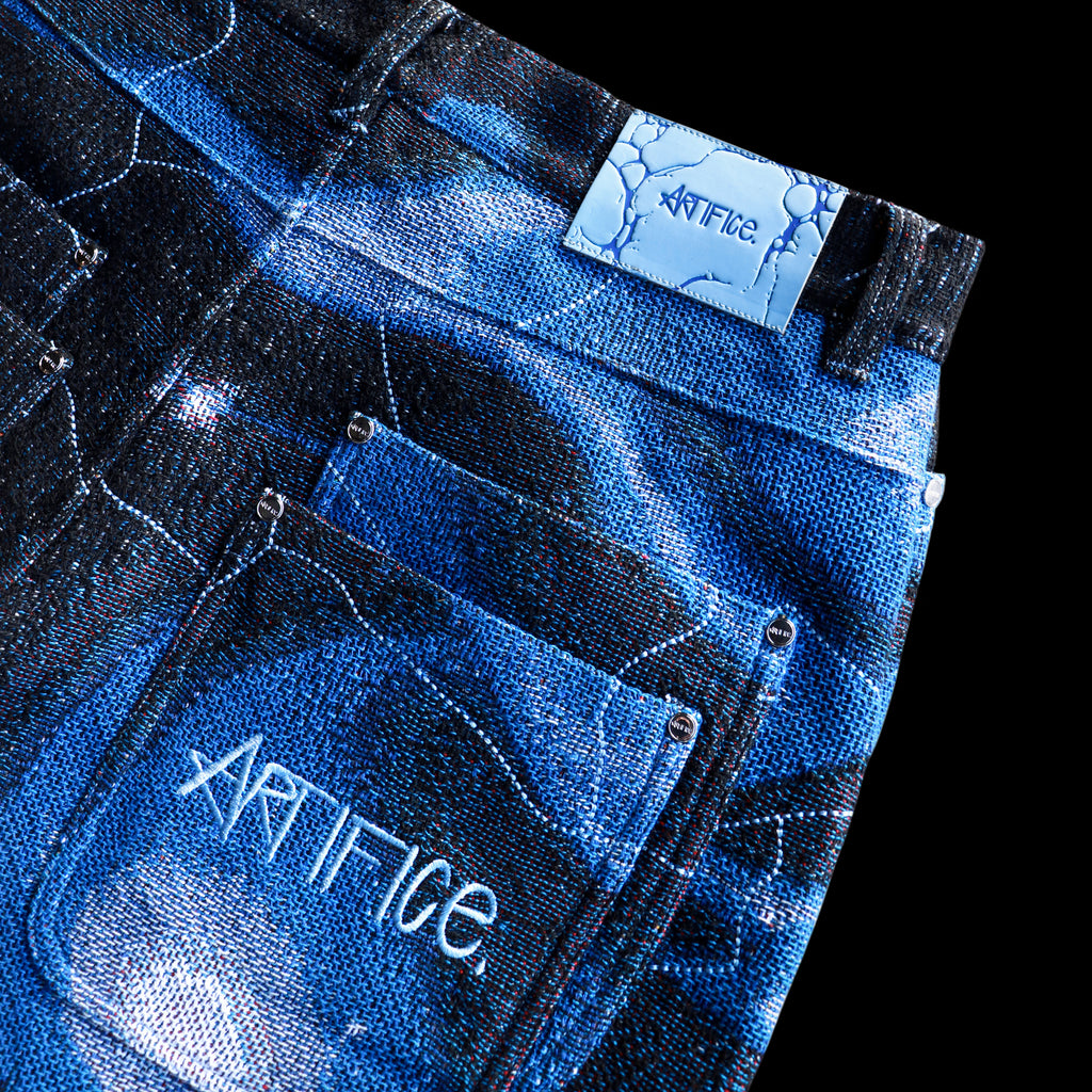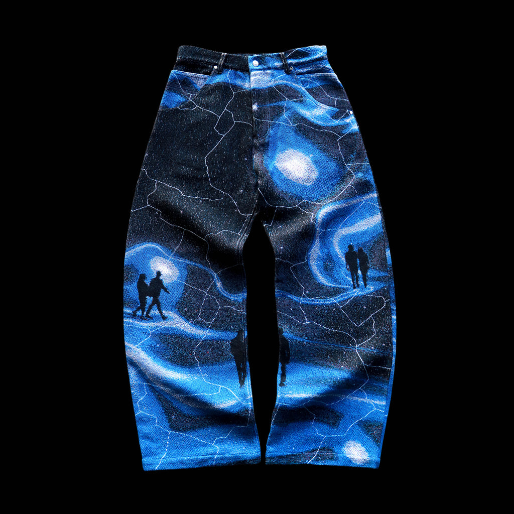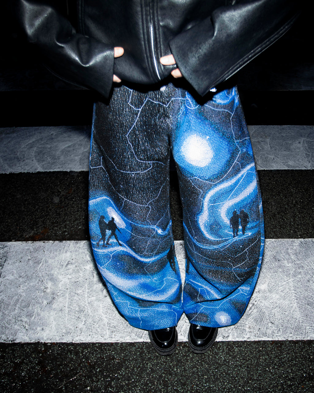 Its pixelated weave transforms imagery into fabric, bridging art and streetwear.